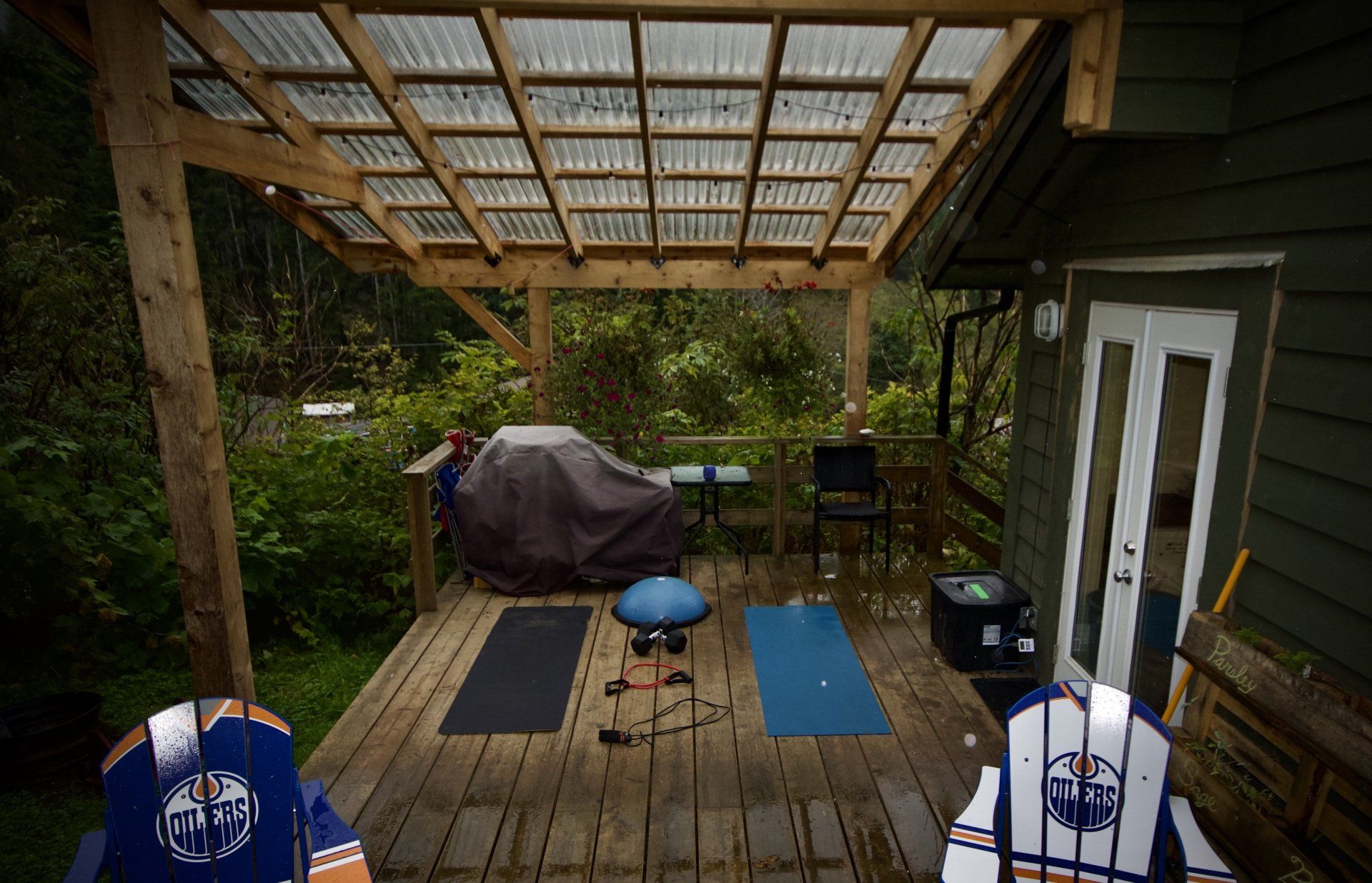 Due to various COVID-19 restrictions, shared gym space remains closed and training locations in Daajing Giids are limited. As a solution to restricted access, Abbey will be operating from the covered outdoor deck space at her home on top of Hippie Hill. For months, this space has personally proved to be a functional space to exercise in a variety of weather conditions.